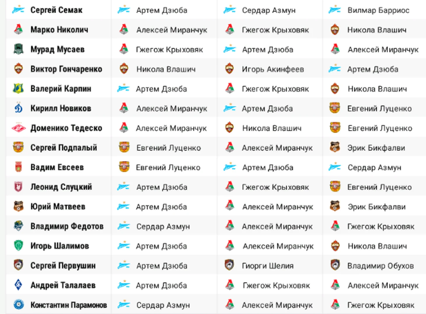 Сразу 7 человек поставили капитана сборной на первое место, 3 на второе и 1 на третье , что удивительно даже Валерий Карпин , чьи взаимоотношения с Дзюбой мягко говоря не дружеские , отдал бомбардиру пальму первенства. Из тех кто не выделил Артема вообще, стали: Константин Парамонов-тренер Оренбурга(к вопросу о том , является ли этот клуб фармом Зенита), Сергей Подпалый-тренер Арсенала (в команде которой Дзюба был перед ЧМ ), Доменико Тедеско-тренер Спартака(после не самого лучшего сезона, еще и проголосовать за самого ненавистного игрока из стана соперников, он не мог), а так же Марко Николич-тренер Локомотива(человек в нашем футболе новый,не до конца наших реалий еще понимающий) , ну и не включи Дзюбу в топ -3 еще и Владимир Федотов -тренер Сочи(но большую часть сезона возглавлявший Оренбург) не знаю почему у тренеров Оренбурга такое отношение к нападающему . В голосовании тренеров хотелось бы еще отметить в топ-3 Алексея Миранчука, он оказался там 10 раз (у Дзюбы 11) из них 3 раза на первом месте , 5 раз на втором и 2 раза на третьем. А так же Гжегожа Крыховяка 7 раз его упомянули в опросе,а тренер Краснодара Мусаев отдал ему первую строчку(очень показательно на мой взгляд) , таким образом футболисты Локомотива в голосовании получили 17 голосов в сумме ,а футболисты Зенита всего 15 раз(из них три голоса Сергея Богдановича Семака),что тоже дает повод задуматься.5 раз в данном рейтинге появился Никола Влашич : 1 раз на первом месте(Гончаренко поддержал своего лидера) ,1 раз на втором (на удивление смело проголосовал Тедеско) и три раза на третьем месте.(что объективно маловато для тащившего весь сезоне ЦСКА хорвата)