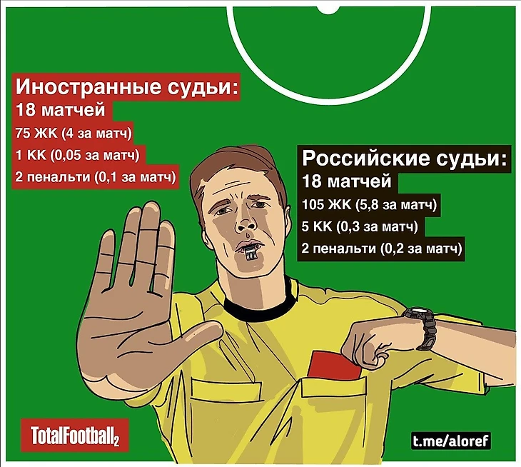 💻 Мы сделали сравнительную инфографику по работе отечественных и зарубежных судей (за основу взяты все игры, которые судили иностранцы, и 18 матчей сезонов 2005-2007 разного калибра - в основном топ матчей, которые судили россияне: уровень соперников и календарь схожи). Инфографику смотрите ниже. По статистике видно, что иностранцы лучше управляли играми: меньше карточек и пенальти. Причём интересно, что львиную долю желтых карточек российские арбитры давали на 80+ минутах - мы-то знаем, за что: а поговорить? А поспорить? А потянуть? С пришлыми такое не работало. 🙅♂️