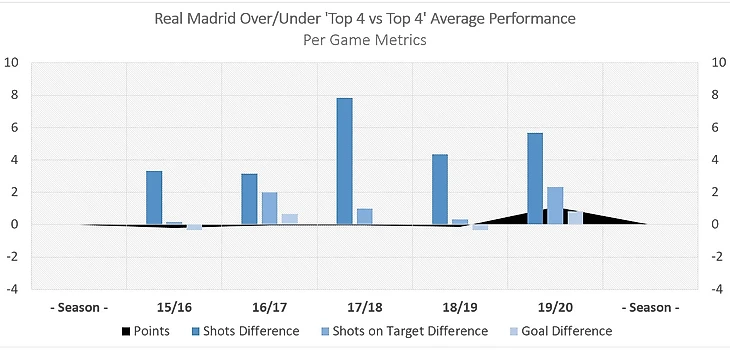 В этой области «Реал Мадрид» проваливался в последнее время. Это первый сезон, когда «Лос Бланкос» были заметно лучше, по крайней мере статистически, любой из трех команд на вершине таблицы. «Мадрид» заработал 2,33 очка в среднем за игру против трех других команд в сезоне 2019\20 (на целое очко выше среднего) по сравнению со средним показателем в 1,21 очка за игру в предыдущих четырех сезонах. «Меренги» под руководством Зидана не проиграли ни одного матча и пропустили только один гол(!) за 559 минут игры (более девяти часов) против лучших команд Испании.