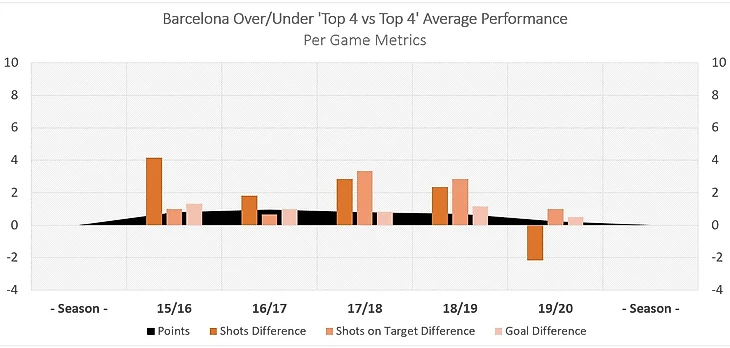 С другой стороны, обратная тенденция была видна в Каталонии. «Барселона», которая была ориентиром в лиге, показала свой худший результат против других лучших трех клубов за десять лет. Они заработали 1,5 очка за игру по сравнению со средним показателем в 2,13 очка за игру в последних четырех кампаниях. Подъем «Мадрида» в сочетании с регрессом их главного соперника (не говоря уже о том, что эти два фактора не коррелируют) объединились, чтобы дать «Реалу» преимущество. Стоит отметить, что рекорд «Реала» в этом сезоне выше, чем в среднем за 4 года у «Барселоны», что еще раз подчеркивает, насколько хорошо они выступили в «мини-лиге». В то же время, нельзя отрицать, что общее количество очков в сезоне далеко от высоких стандартов, заданных в далекой кампании 2009\10.