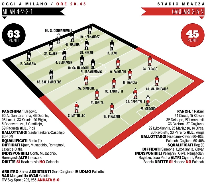 К сегодняшней встрече команды подходят с абсолютно разной боеготовностью - если у "Милана" имеются определенные кадровые потери, то вот у "Кальяри" с этим огромные проблемы.