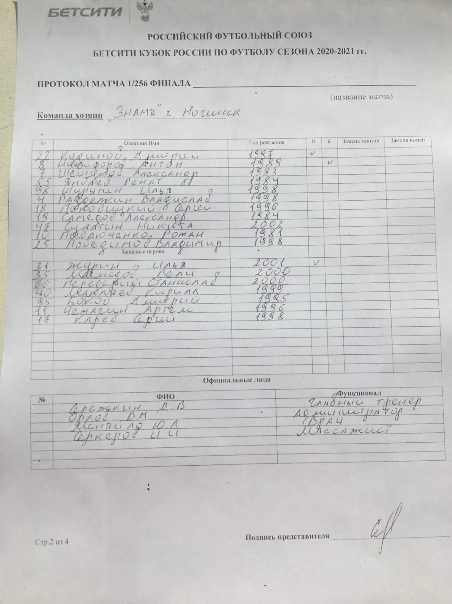 В Орехово-Зуево «Знамя» из Ногинска выиграло у местного «Знамени труда» 1:0. Вместо картинки-афиши выкладываем эксклюзив: фото одной из страниц протокола матча с составом формальных хозяев: участвуют Янбаев, Самедов и Павлюченко! Что-то нам подсказывает, что они могут далеко продвинуться по сетке турнира.