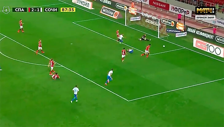 Жиго не совершал никаких движений навстречу, а мяч после сейва Максименко отскочил вдоль лицевой – совсем не туда, куда направлялся Немченко. У игрока «Сочи» точно не было возможности сыграть на добивании.