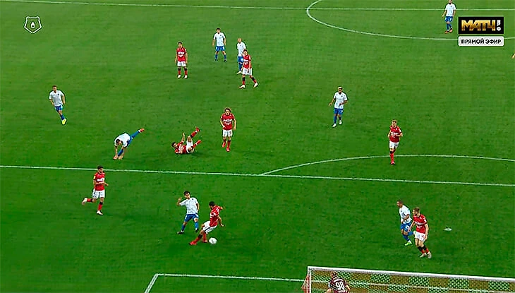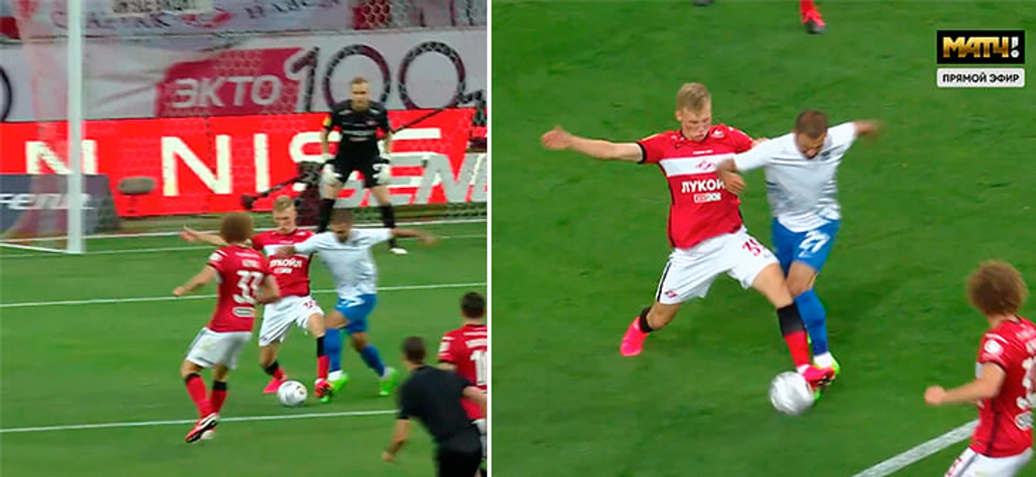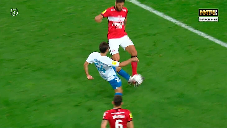 Очевидно, что Павел Маслов и Кирилл Заика идут на мяч одновременно, друг о друге не думают, каждый старается сыграть первым. Похоже, что касается мяча первым именно Маслов. Судьи, вероятно, трактовали момент так: защитник «Спартака» не настолько опередил соперника, чтобы сыграть однозначно первым, поэтому перевесила его игра в ногу Заики – похоже, касание ног действительно происходит раньше, чем до Маслова долетает мяч.