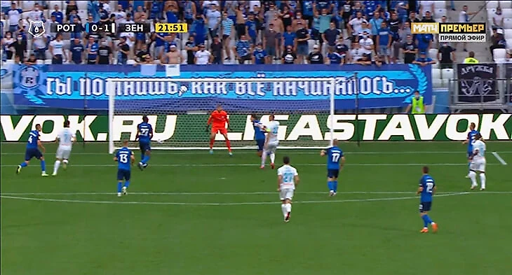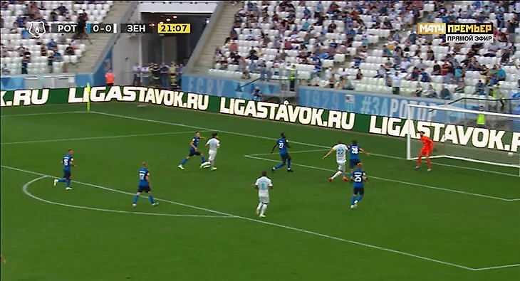 До 22-й минуты. Дуглас Сантос забросил в штрафную на Дзюбу, защитники вынесли, и мяч оказался у Антона Пискунова. Тот обработал в своей штрафной, но не почувствовал давления Дриусси, который забрал мяч и сразу прострелил на дальнюю. Дзюба замкнул.