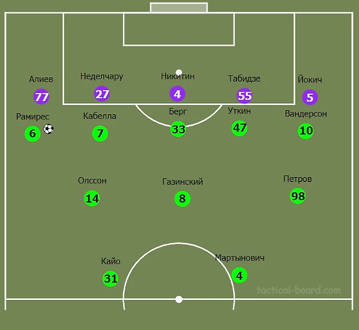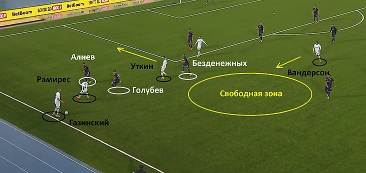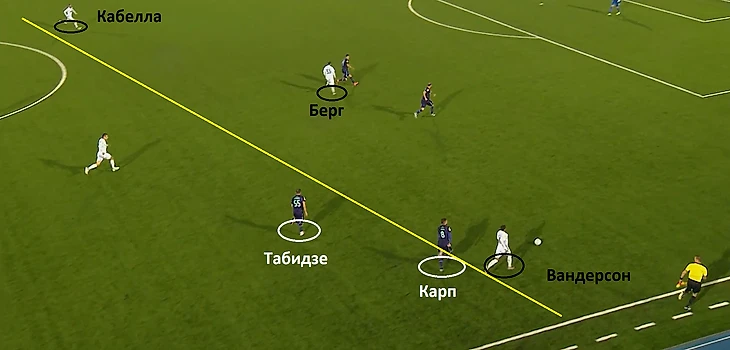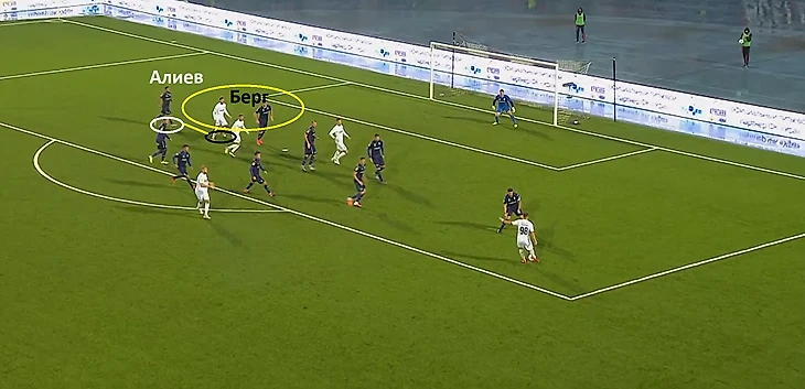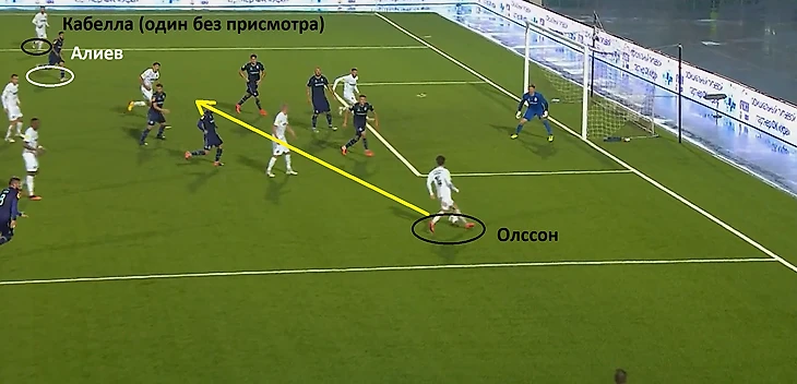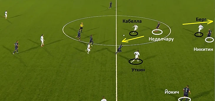 Началась атакующая комбинация со смещения Кабеллы в центральную зону. Футболист средней линии гостей «увел за собой» центрального защитника Неделчару и, тем самым, открыл свободную зону, которой воспользовался Берг. Помимо этого, французкий игрок отдал передачу на оставшегося без присмотра Даниила Уткина.
