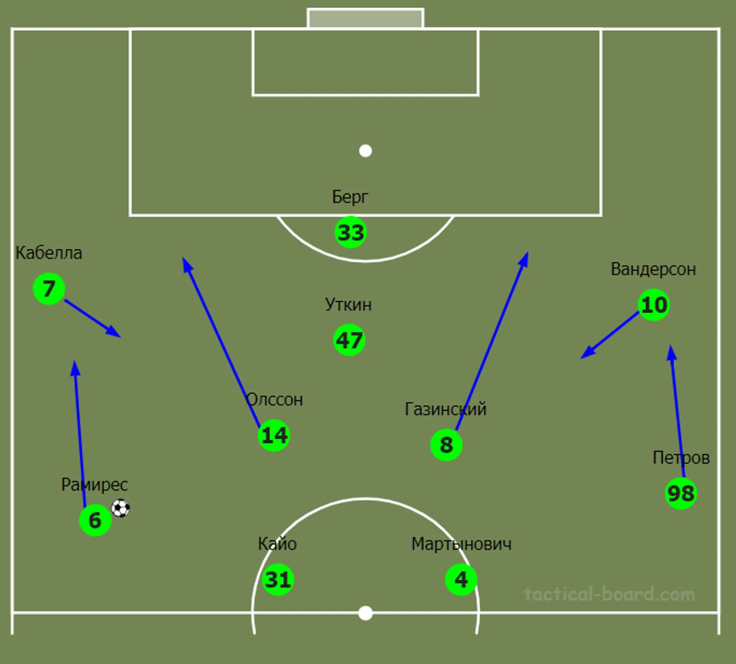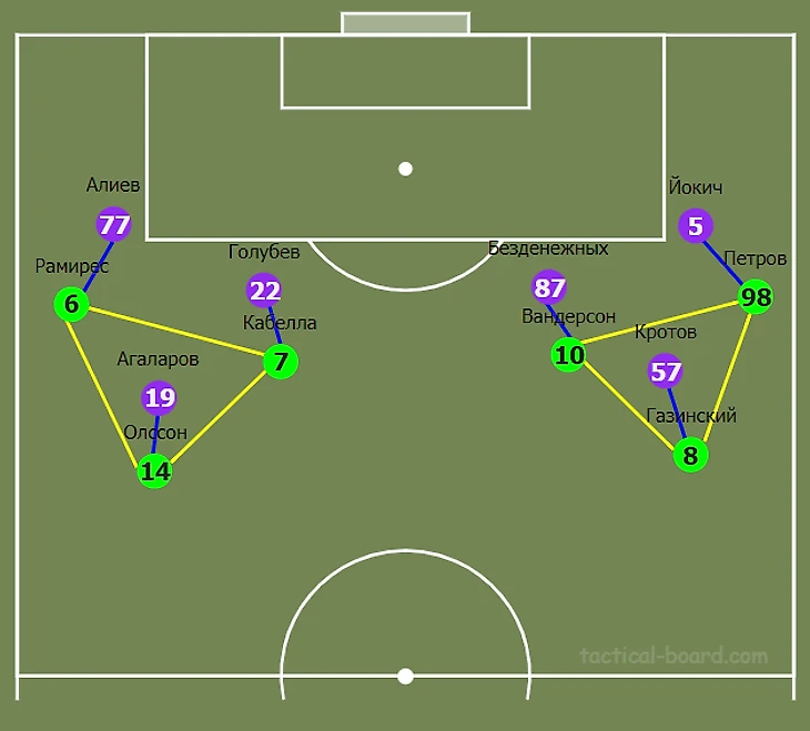 Большинство атак Краснодара, особенно в первом тайме, начинались на флангах. На левом краю поля тройку составляли Рамирес, Кабелла и Олссон, а на правом Петров, Вандерсон и Газинский. Хавбеки смещались в полуфланги, а защитники «создавали ширину». Необходимо отметить, что игроки средней линии действовали более свободно и могли менять позиции. Схематично данная «задумка» выглядела так:
