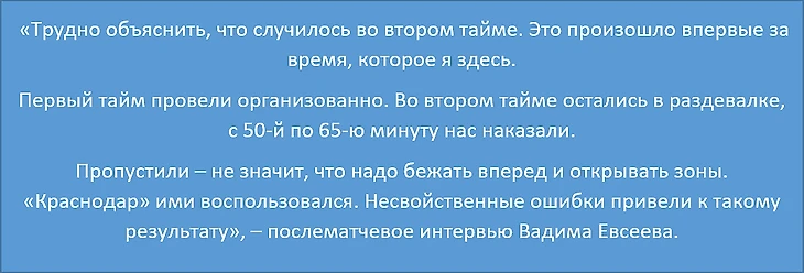 Сразу после пропущенного мяча у хозяев на поле вышли Вомбергар и Гиоргобиани вместо Агаларова и Кротова. Ни Андреас, ни Николай отметиться результативными действиями не смогли.