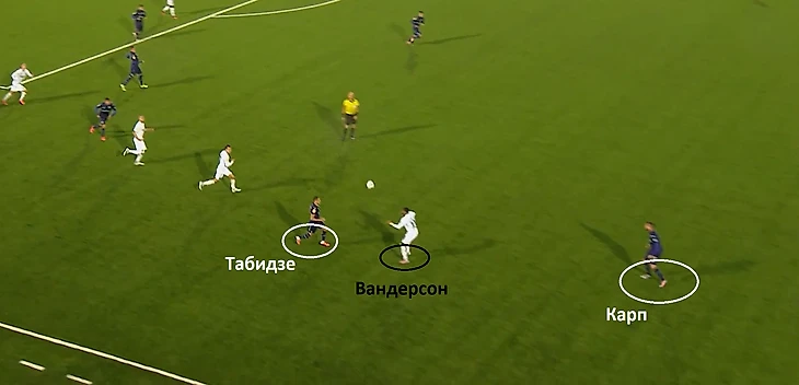 Грузинский защитник Уфы сразу же вступил в прессинг и решил отобрать мяч у бразильского футболиста, но эта попытка оказалась неудачной. В большинстве подобных случаев игроки обороны применяли «тактический фол» для срыва опасной контратаки, пусть даже ценой желтой карточки. В этой ситуации Табидзе упустил оппонента. Набрав высокую скорость, Вандерсон легко убежал от Каталина Карпа, фактически создав выход три в два.