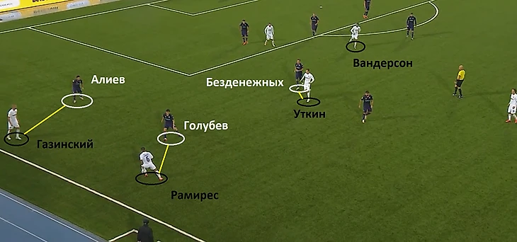 В качестве примера можно взять один эпизод в первом тайме. На первом кадре можно заметить, как гости использовали смену позиций (Газинский оказался на левом фланге атаки). Игроки Уфы «разобрали» своих соперников. Игорь Безденежных в данном моменте опекал Уткина.