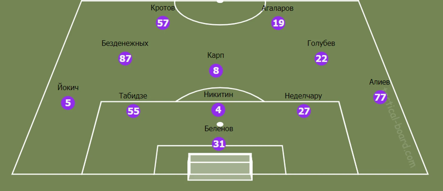 Вадим Евсеев, в отсутствие новых футболистов, выбрал наиболее оптимальный состав из тех игроков, что у него остались. Единственное, что могло вызывать вопросы, выход Азера Алиева на правый фланг в то время, как на скамейке запасных находился Александр Сухов (в сезоне 19/20 на этой позиции сыграл 25 раз).
