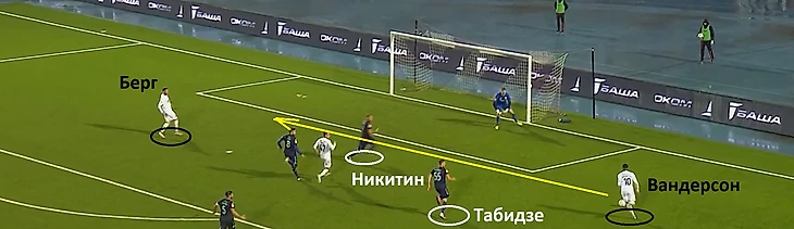 Т.к. Табидзе снова не успел за Вандерсоном, помочь своему одноклубнику попытался Никитин. Алексей побежал в сторону бразильского игрока, но при этом оставил без опеки Берга. Фактически, своим решением Никитин выключился из эпизода, поскольку ни помешать Вандерсону, ни закрыть шведского нападающего защитник Уфы не смог.