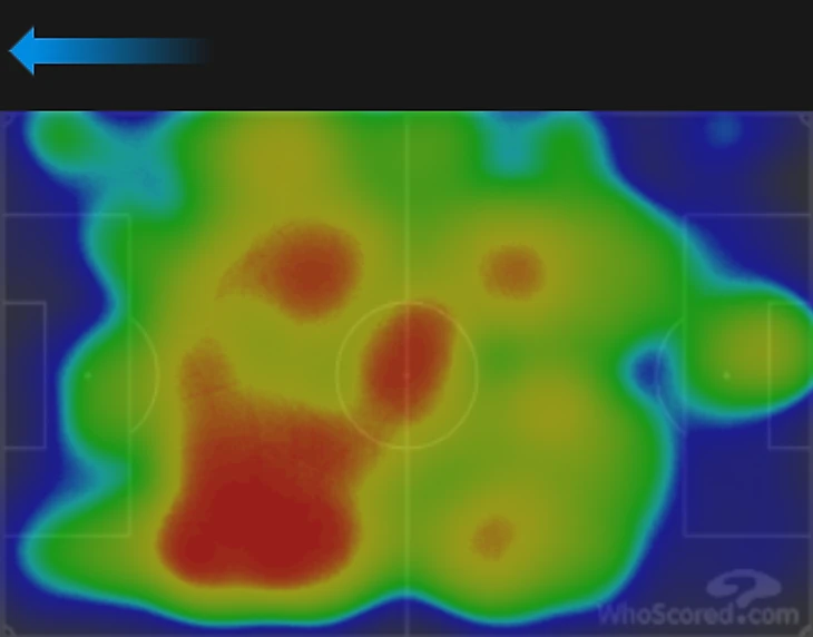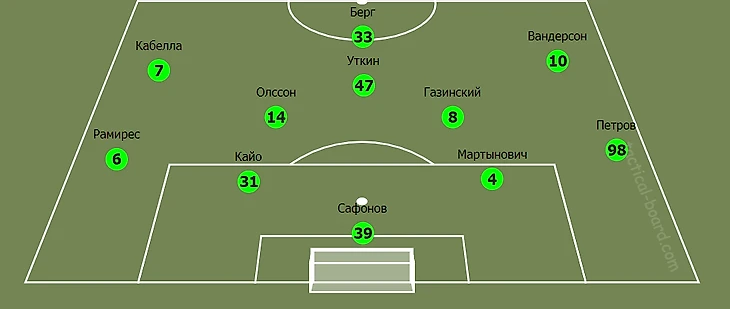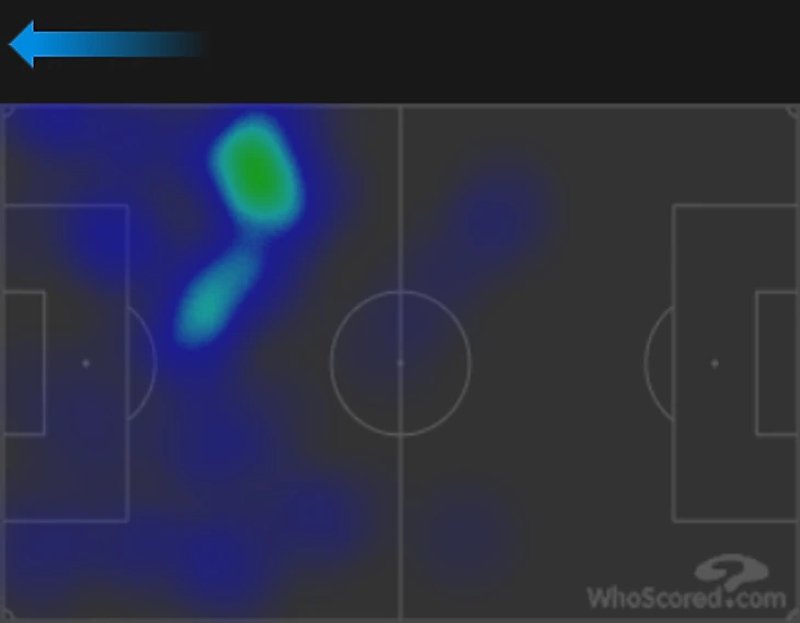 Гости прекрасно знали об этом и пытались поразить ворота Беленова не только при помощи поиска свободных зон, но и непосредственного их создания. В этом им должна была помочь смена позиций игроков средней линии «быков». Стоит взглянуть лишь на тепловую карту Вандерсона, чтобы убедиться данном высказывании.