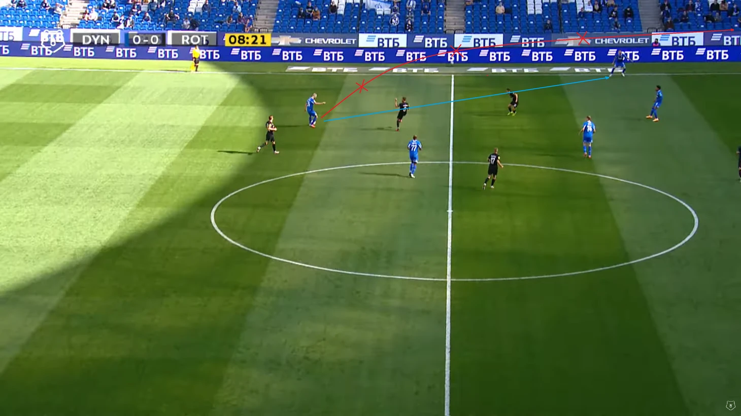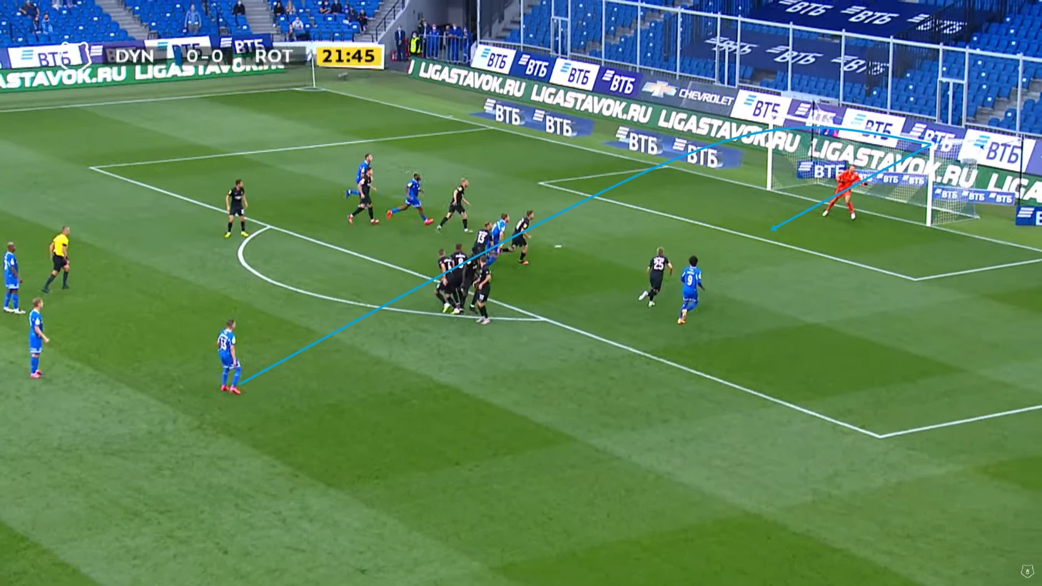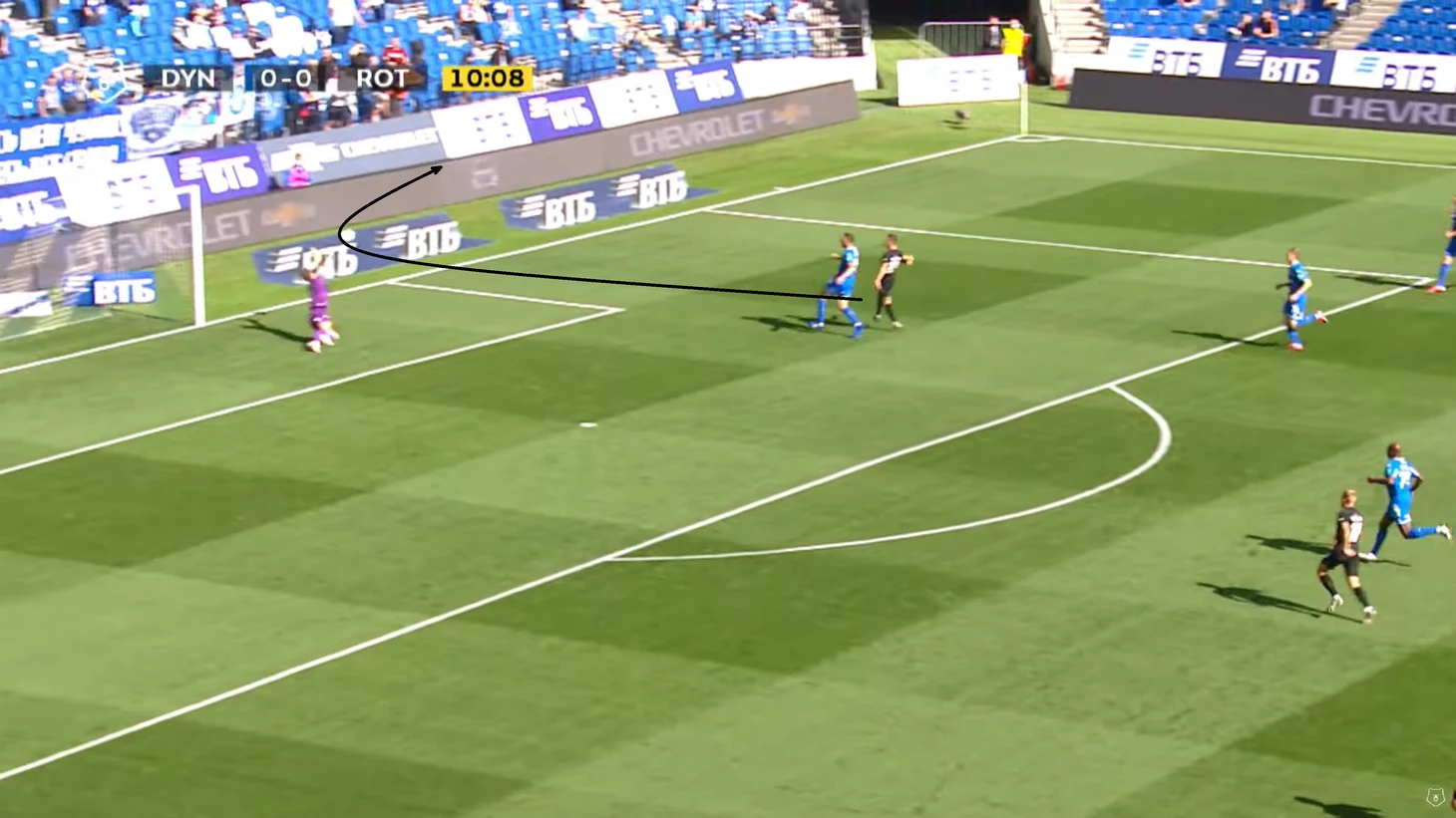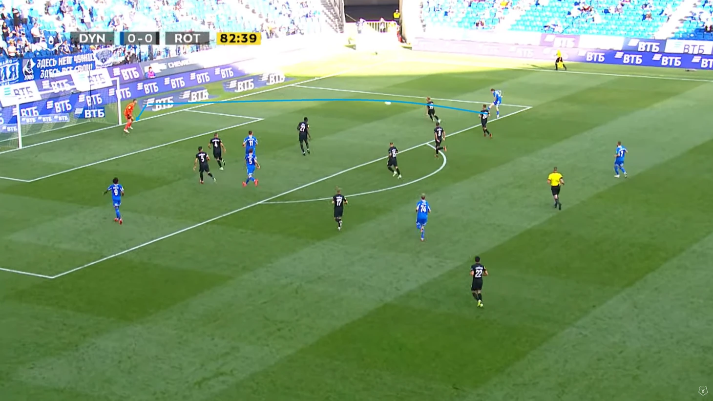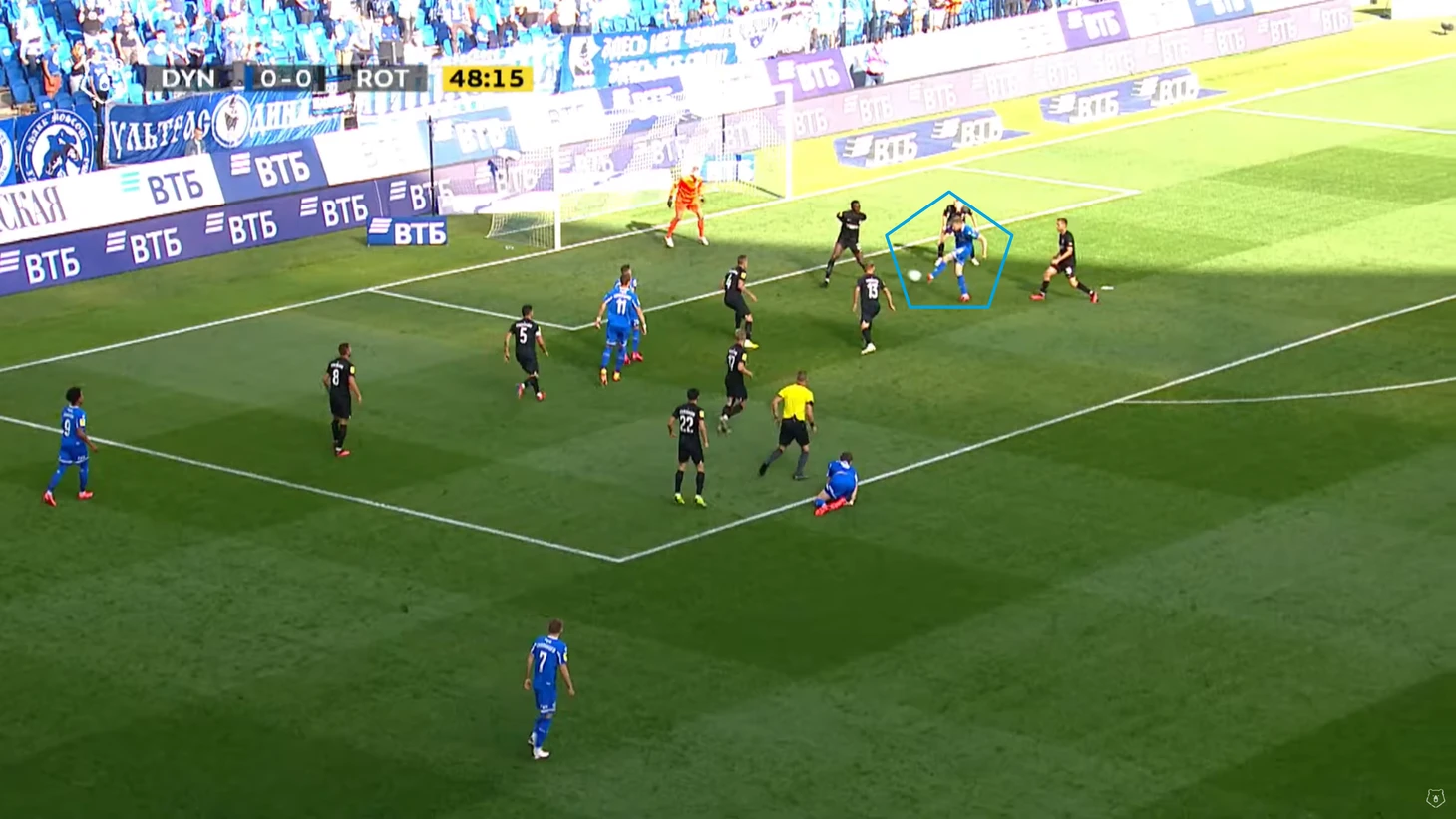 Увы, и этот опасный момент не стал триггером для более активных действий со стороны Динамо. Мы всё также пытались доставить мяч вперёд, а Ротор грамотно отбивался, перекрывал зоны, при этом постоянно держа в уме возможности для контратак. Возможно одной из причин такой игры Динамо стала незаметность Фомина (в первом тайме можно разве что вспомнить его неоднозначный подкат на 35 минуте). Если в прошлой игре он показал как может умно обострить игру, то в этой игре он был лишь своей тенью, что также можно записать в плюсы Ротору. Под умной игрой я подразумеваю, к примеру, обманки соперника с помощью простых финтов, как например на 27 минуте. Шиманьский, принимая мяч от Нжи, обработал мяч не щекой правой ноги, а шведой левой ноги, к чему не был готов защитник Ротора, пролетевший мимо полузащитника Динамо и тем самым открыв зону для опасного удара по воротам. Увы, спина другого защитника перевела мяч на угловой, который ничем опасным не закончился.