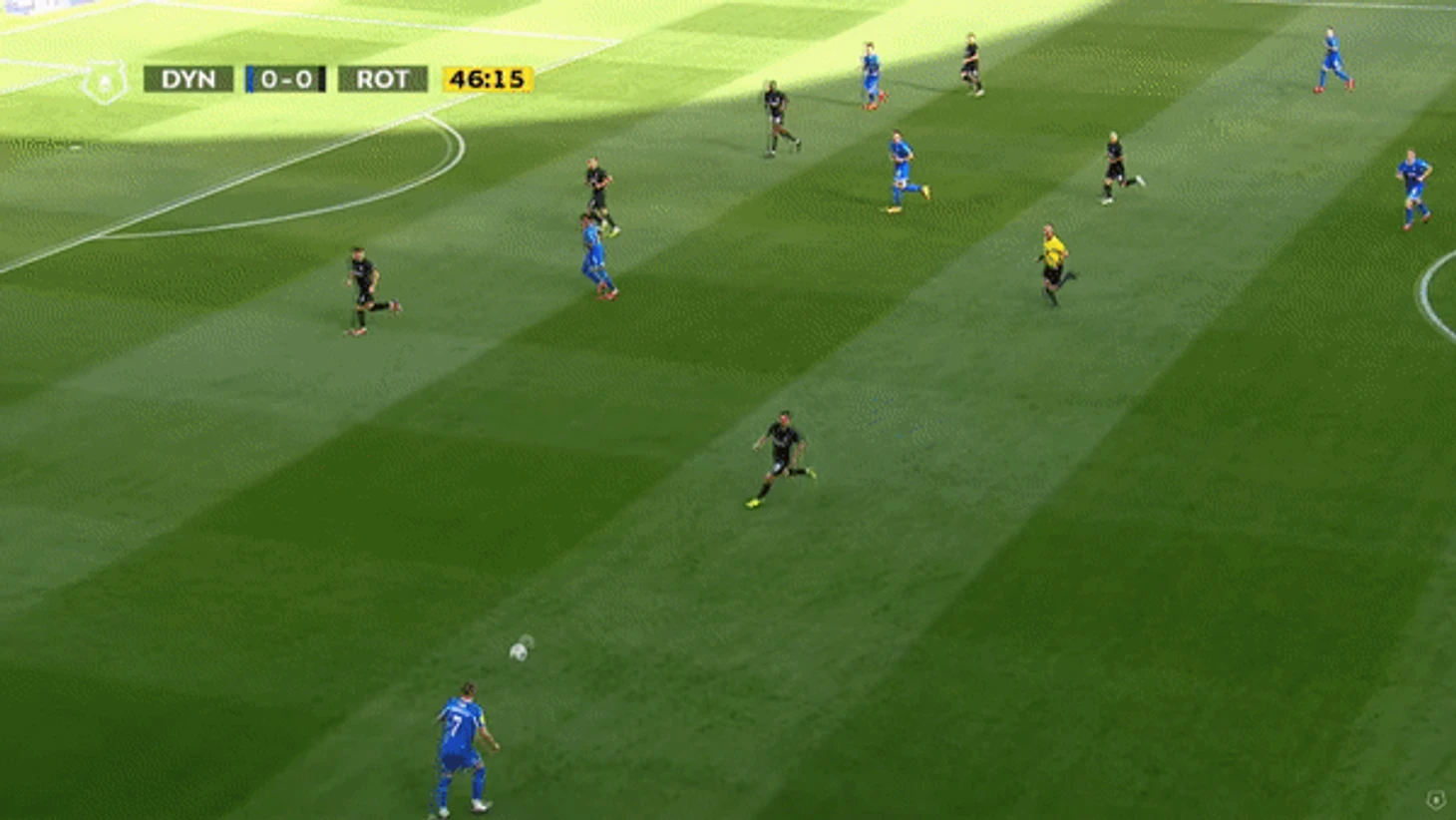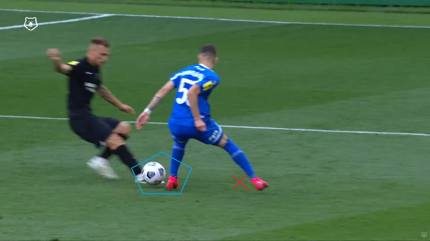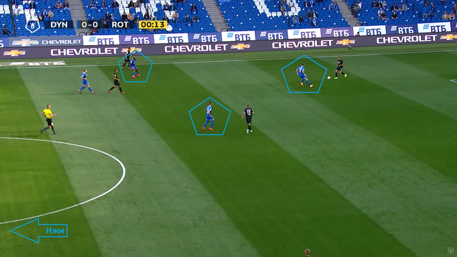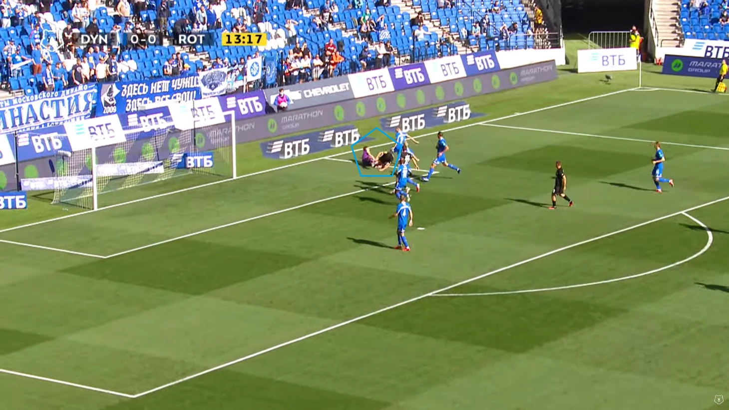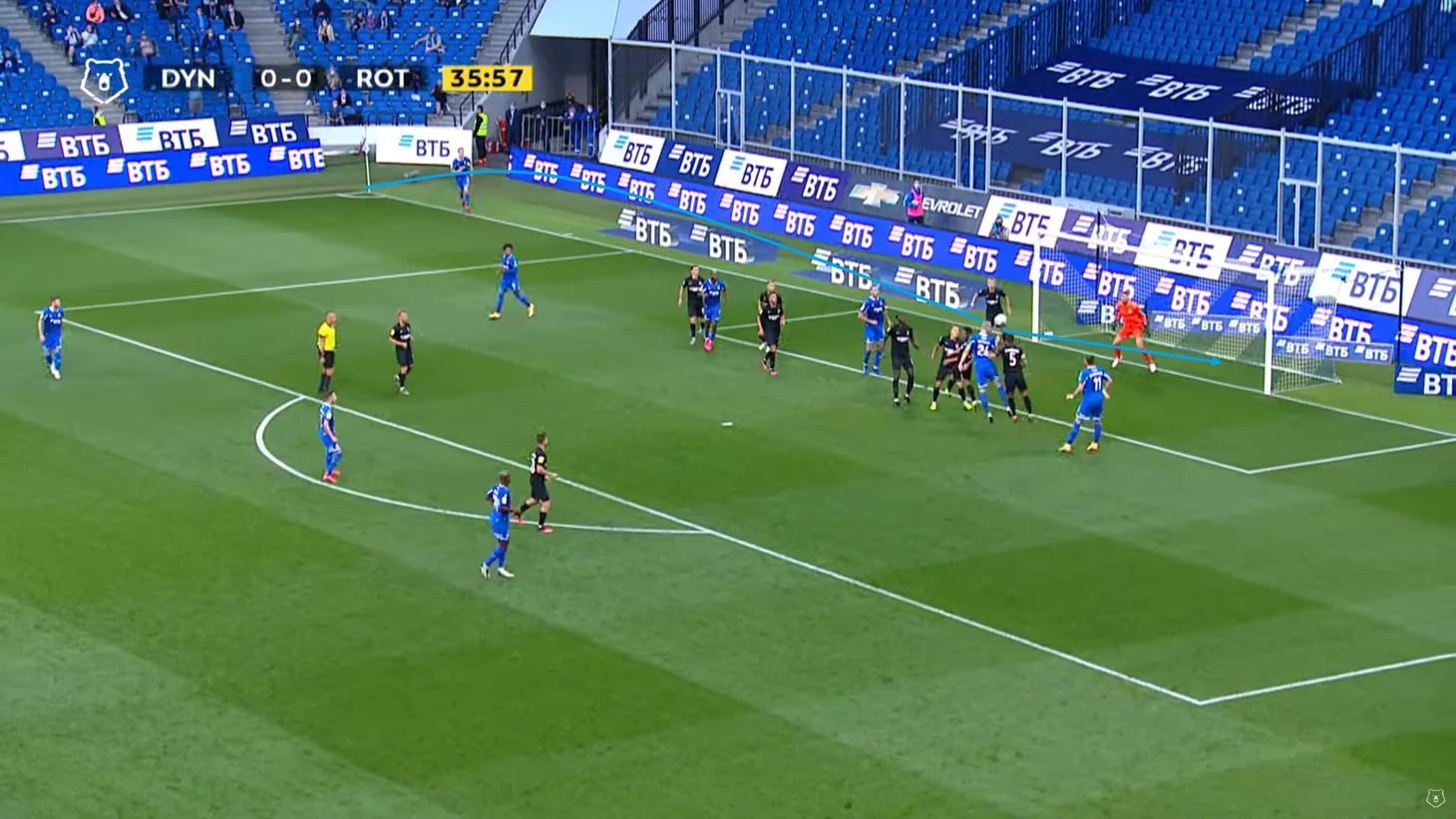 Увы, и этот опасный момент не стал триггером для более активных действий со стороны Динамо. Мы всё также пытались доставить мяч вперёд, а Ротор грамотно отбивался, перекрывал зоны, при этом постоянно держа в уме возможности для контратак. Возможно одной из причин такой игры Динамо стала незаметность Фомина (в первом тайме можно разве что вспомнить его неоднозначный подкат на 35 минуте). Если в прошлой игре он показал как может умно обострить игру, то в этой игре он был лишь своей тенью, что также можно записать в плюсы Ротору. Под умной игрой я подразумеваю, к примеру, обманки соперника с помощью простых финтов, как например на 27 минуте. Шиманьский, принимая мяч от Нжи, обработал мяч не щекой правой ноги, а шведой левой ноги, к чему не был готов защитник Ротора, пролетевший мимо полузащитника Динамо и тем самым открыв зону для опасного удара по воротам. Увы, спина другого защитника перевела мяч на угловой, который ничем опасным не закончился.