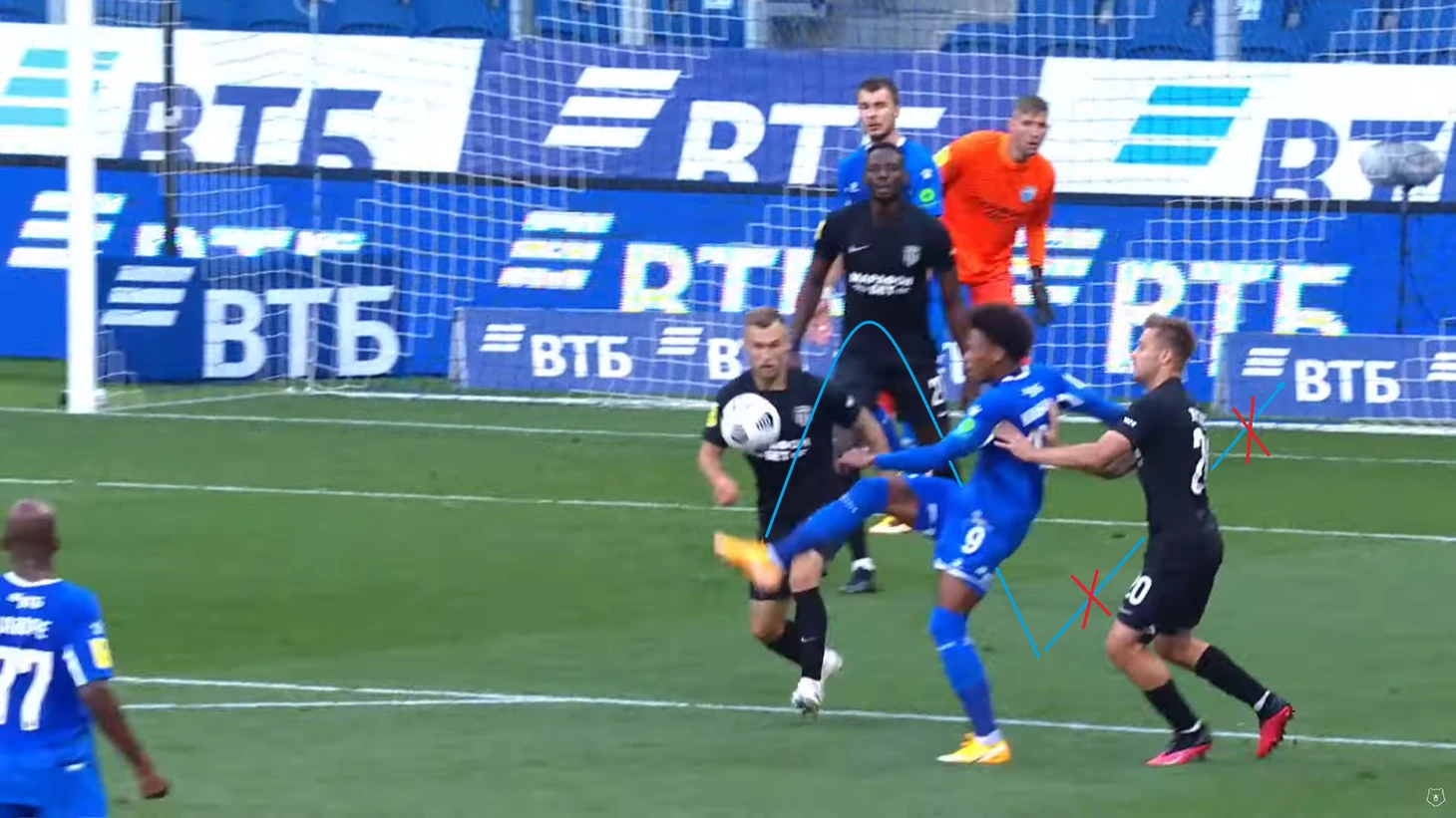 В прошлой статье я писал про миллиметровую неточность приёма мяча Шиманьским. Этот момент прекрасно демонстрирует, как это важно сыграть тонко, с точностью до миллиметра, чтобы создавать моменты. Себастьян один из немногих, кто продемонстрировал своё мастерство на уровне, хотя может и лучше. Ещё одним игроком, кто не сильно снизил уровень своей игры является Каборе (кроме грубой ошибки на 58 минуте), от чего я задаюсь вопросом, что мешало ему так играть в прошлом сезоне (одна игра против Краснодара не в счёт)? Также стоит отметить, что мяч Себастьяну был доставлен тремя пасами в одно касание (Паршивлюк - Каборе - Нжи), что становится ещё одной особенность игры нынешнего Динамо. Лишь спустя десять минут Динамо нанесло один из редких ударов в створ. Это Евгеньев пробил с углового точно, но не опасно для вратаря:
