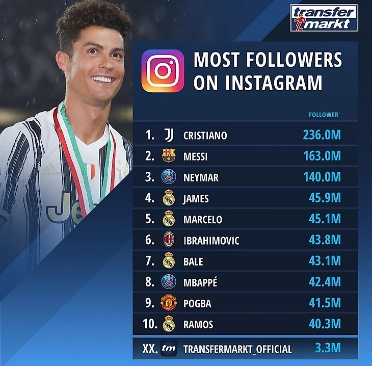 Transfermarkt: Футболисты с наибольшим количеством подписчиков в Instagram