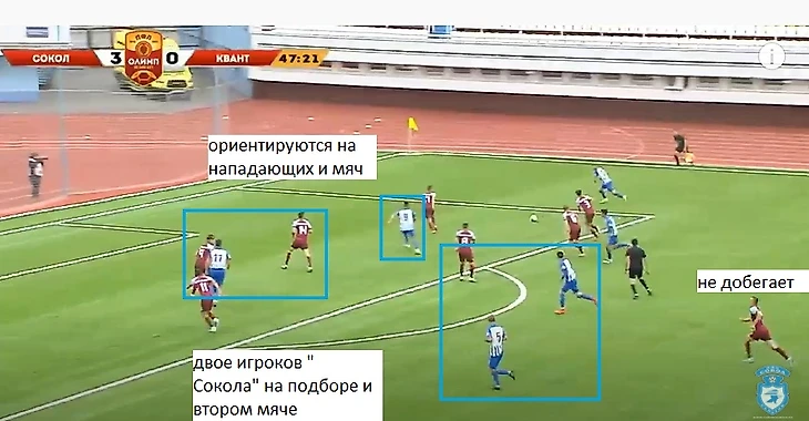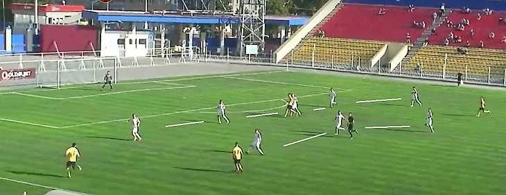 Во — первых, расположение « Сокола» при билд — апе сразу дало ощутимые преимущества против 4-4-2 « Кванта» (переходили в 4-3-3). Фланги получали колоссальное преимущество, двое опорных контролировали центр, а линия обороны действовала широко при владении. Плюс при давлении «Сокол» мог начать атаку длинным пасом в края ( например, 3 гол был так и забит):