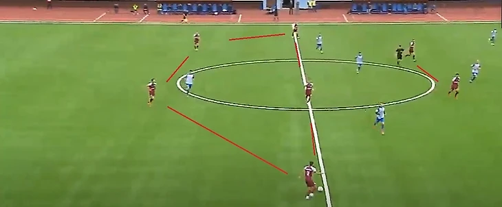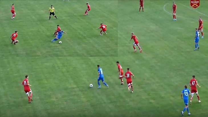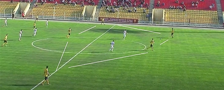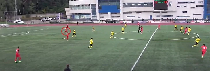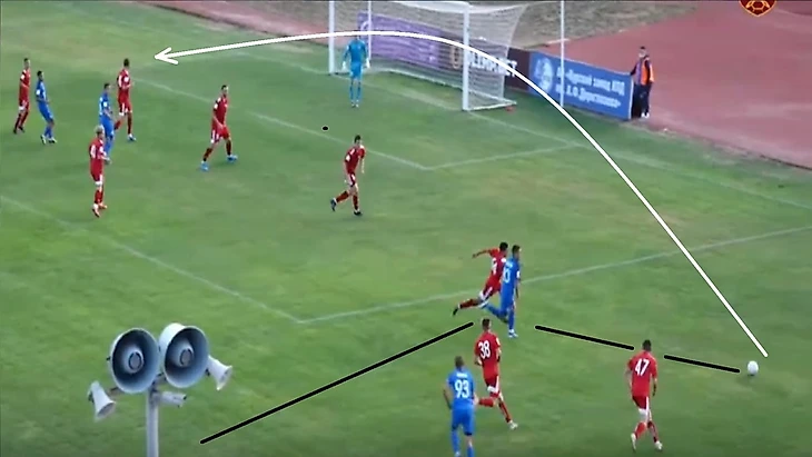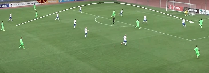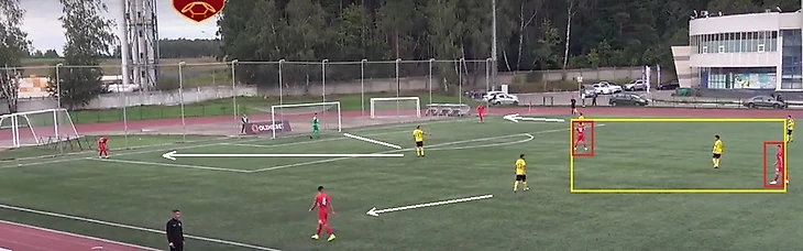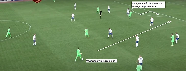«Красный» вообще отлично использует пространство за спинами и в полуфлангах — отметим, что для этого большую роль играют Ларионов, Федоров и Корнеев. Про первого можно сказать, что он управляет ритмом и направлением атак в их начальной фазе, правда, длинные переводы не всегда точные. Отметим и его бойцовские качества, он не боится идти в единоборства. А Федоров -уменьшенная копия Эриксена ( с поправкой на уровень): он постоянно двигается в поисках мяча, открывается между линиями и продвигает мяч через пас, отрезая нескольких игроков. Сюда же надо добавить похвалу всей системе Булатова: команда здорово наполняет каналы между фланговым и центральным защитником, открывает зоны за счет движения и создает изоляцию для левого защитника ( пока не работает), а также готова физически ( сразу вступает в отбор,а не откатывается назад):