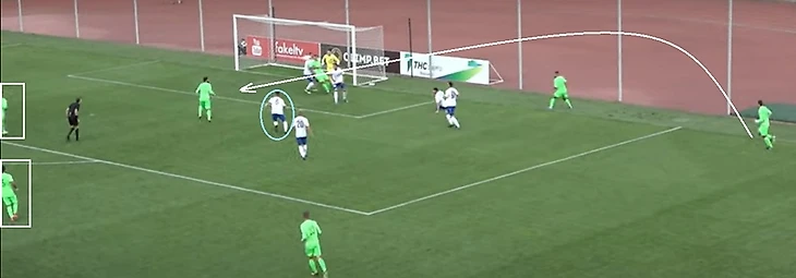 Смотрите за корпусом всей линии обороны, Лелюхин уже начинает замах, нападающие уже начинают рывок, но тройка дальних защитников смотрит в мяч. Помимо этого атакующая система с поднятым Жумабековым заставляет вываливаться его из штрафной для страховки. Например, при втором голе после подачи с углового, он опять был неправильно развернут и, как следствие, не дотянулся головой из — за этого.