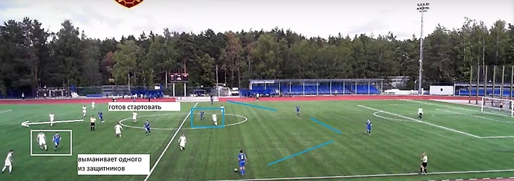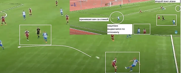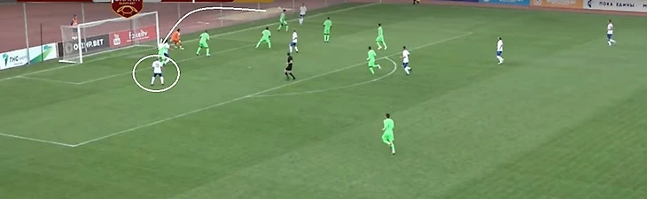 Второй момент сложнее — неизвестно, какие требования при обороне предъявляет своим игрокам тренер «Калуги», но мы склоняемся к тому, что Суханов снова не оценил до конца обстановку; ни один из защитников не оказывал плотного давления на игрока в синем, а Суханов, хоть и прибежал помочь, все равно не перекрыл линию передачи: