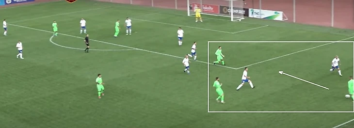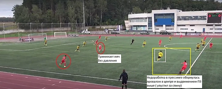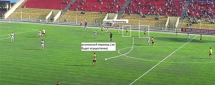 « Строгино» хоть и стремится к позиционному футболу, испытывает большие проблемы в продвижении мяча. Во — первых, игроки центра поля банально мало вертят головой, что позволяет атаковать их со спины (следовательно, пас пойдет назад или будет перехват). Во — вторых, практически не принимают мяч вполоборота, что является катастрофической ситуацией. Ниже эпизод, где игрок мог опуститься ниже и левее ( для атаки; вправо нельзя, там оппонент), что позволило бы подняться выше ЛЗ, но игрок принимает мяч спиной: