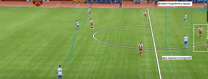 Впрочем, мы должны оговориться: вполне вероятно, что защитники хозяев по плану и должны были оказывать давление, с учетом того, что в центре зачастую было только два игрока « Калуги» ( схема в первом тайме 5-3-2, иногда 5-2-2-1 по обстоятельствам). Вероятно, что Дзуцев решил нивелировать фланговую активность гостей и иметь преимущество в первой фазе против двух ЦЗ. Тогда непонятно, почему не было давления в первом тайме, но тренерскому штабу виднее.