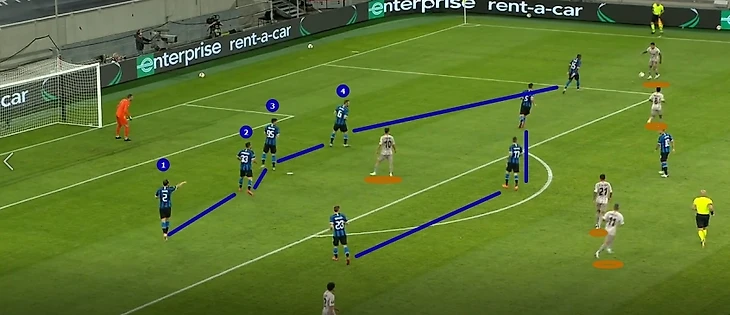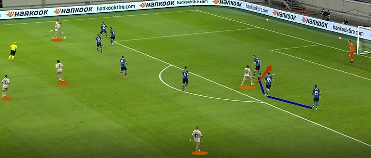 При вводе мяча от ворот Пятовым Лукаку и Мартинес разбирали двух центральных защитников, с Антонио и Степаненко играли Гальярдини и Барелла, а если глубже опускался Патрик, то за ним тут же следовал Брозович.
