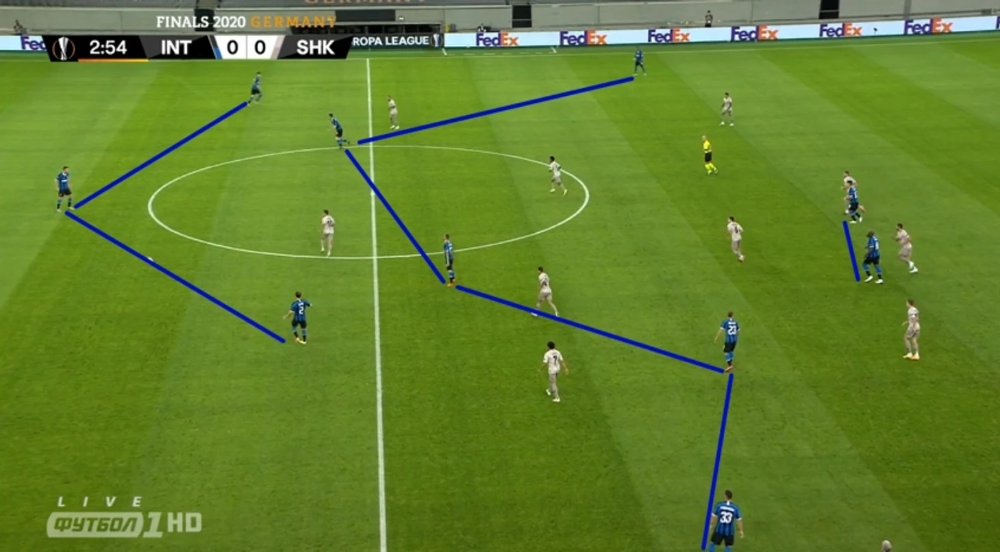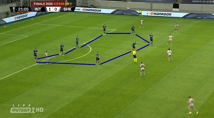 Команда Конте при позиционной обороне создавала блок 5-3, который пройти было крайне сложно. Хавбеки выдавливали соперника на фланги, где импульс атак «Шахтера» угасал. Порой в позиционных атаках дончан ловил себя на мысли, что смотрю регби: «горняки» передавали мяч друг другу без продвижения, поперек поля, как в регби, где нельзя отдавать пас вперед.