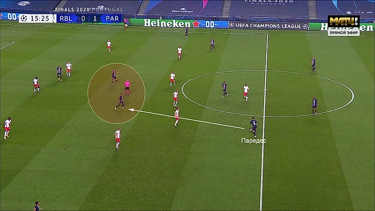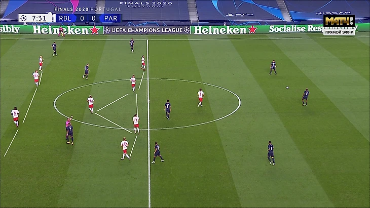 7. Продуманная и отлаженная структура розыгрыша «ПСЖ» нацеливалась на то, чтобы выманивать соперника в прессинг. У «Лейпцига» было два варианта. Первый – минимум один полузащитник (например, Забитцер) выдвигается в прессинг, но команде становится труднее контролировать опорную (а там «ПСЖ» всегда держал минимум двух игроков).