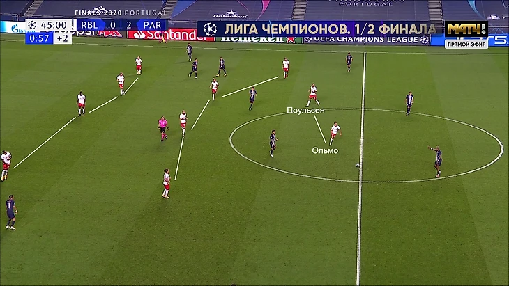 11. Уже к концу первого тайма «Лейпциг» сменил схему при обороне. Дани Ольмо стал играть ближе к Юссуфу Поульсену в 4-4-2: