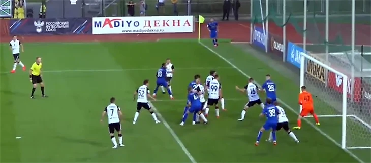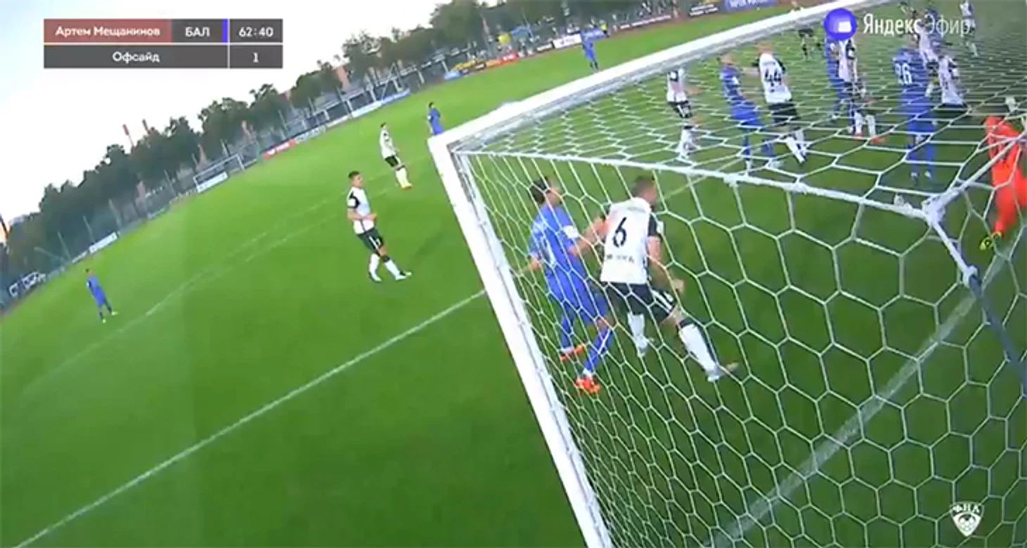 Однако, зафиксировав его, судьи не сразу разобрались, от кого именно – калининградца Мещанинова (№26) или всё того же торпедовца Шоркина (№16) – окончательно срикошетил мяч в сетку. А ответ на сей вопрос имел уже принципиальное значение. Ведь в первом случае это - офсайд, а во втором - гол (смотрите скрин-шот ниже):