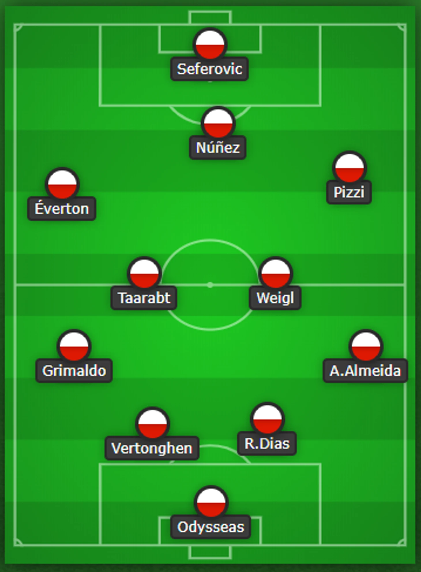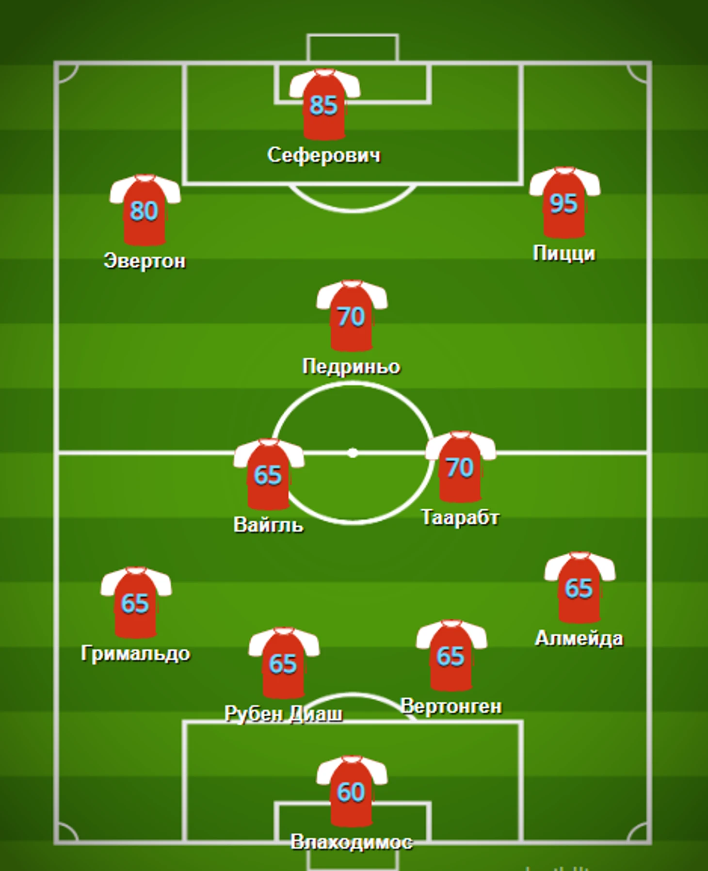 Полузащита начинается со скучной связки Таарабта (7.0) и Вайгля (6.5). Выше - сложнее. Точно есть место справа для лидера команды Пицци (9.5). Прошлогодние 18+14 внушают! Слева верится в Эвертона (8.0). Шустрый парень, в команду вписался быстро. А вот ещё одного игрока линии атаки выбрать сложно. Здесь есть Рафа Силва (8.5) со всем его опытом, талантливый Педриньо (7.0), а также много игравший в предсезонке Дарвин Нуньез (7.0).