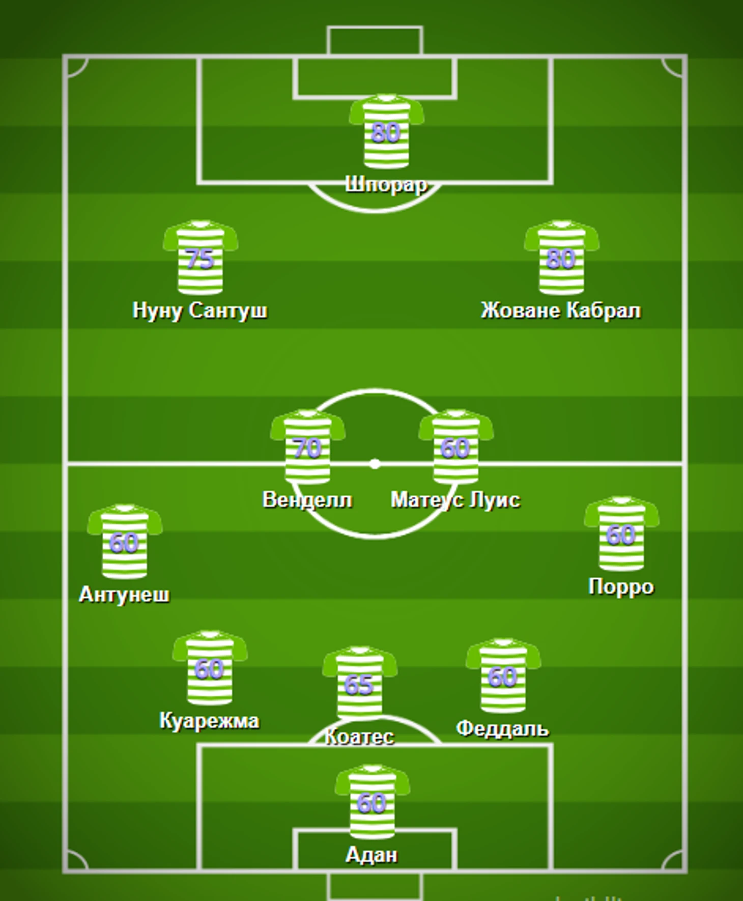 В защите Спортинга царила чехарда, полузащитники играют защитников, защитники играют полузащитников, хорошо ещё хоть в ворота не встают. Поэтому надо понимать, что перестановки в этой линии возможны с высокой вероятностью. И есть ощущение, что центральных защей будет всё-таки три. Это Коатес (6.5), Куарежма (6.0) и Феддаль (6.0). С флангов не удивлюсь увидеть пришедшего из Хетафе Антунеша (6.0) и арендованного из Манчестер Сити юного Порро (6.0).