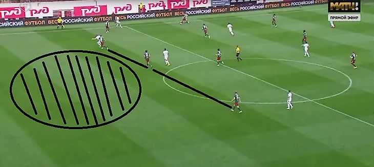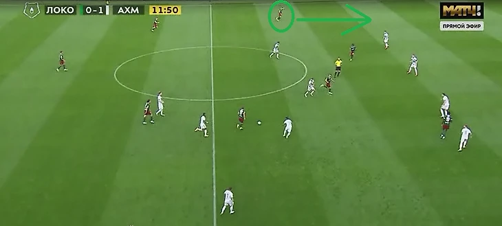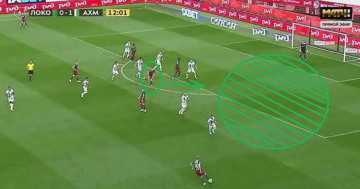Антон увидел перед собой свободное пространство, он поднимает руку и просит передачу у Рифата, но Жемалетдинов медлит и перемещается сам вместе с мячом ближе к левому флангу. В результате чего свободная зона заполняется защитниками «Ахмата». Спустя 10 секудн Антон находит свободную зону уже на другом фланге.