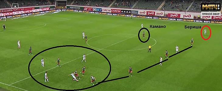 На левом фланге была борьба 4 в 4, Миранчук активно участвовал в оборонительных действиях, сюда же сместились Куликов и Крыховяк. Камано же на правом фланге выступил как рядовой болельщик и лишь наблюдал за ситуацией, когда Бериша остался один за спиной у Игнатьева. Игнатьев же в этом моменте играет по Мелкадзе, который находится перед ним. По сути Влад остался один против двух соперников и вполне объяснимо эту борьбу проиграл.