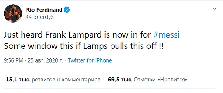 Новостные СМИ разорвала новость о том, что Месси перейдет в "Челси". Все из-за твита Рио Фердинанда. Во-первых нет никаких гарантий, что Рио не пошутил. Тем более шутка имеет смысл, "Челси" уже взорвал это трансферное окно, мол и Месси они тоже купят. Во-вторых это не было подтверждено авторитетными источниками. В-третьих не понимаю зачем проекту Лэмпарда Лео Месси. В-четвертых не понимаю зачем Лео Месси проект "Челси". "Челси" прямо здесь и сейчас не является одним из главных фаворитов ЛЧ, а у Месси возраст. В-пятых, даже если это все правда( что крайне сомнительно) и к Рио просочилась эксклюзивная информация, это всего лишь значит, что "Челси" собирается купить Месси, хочет. В мире мало команд которые хотели бы приобрести Месси?