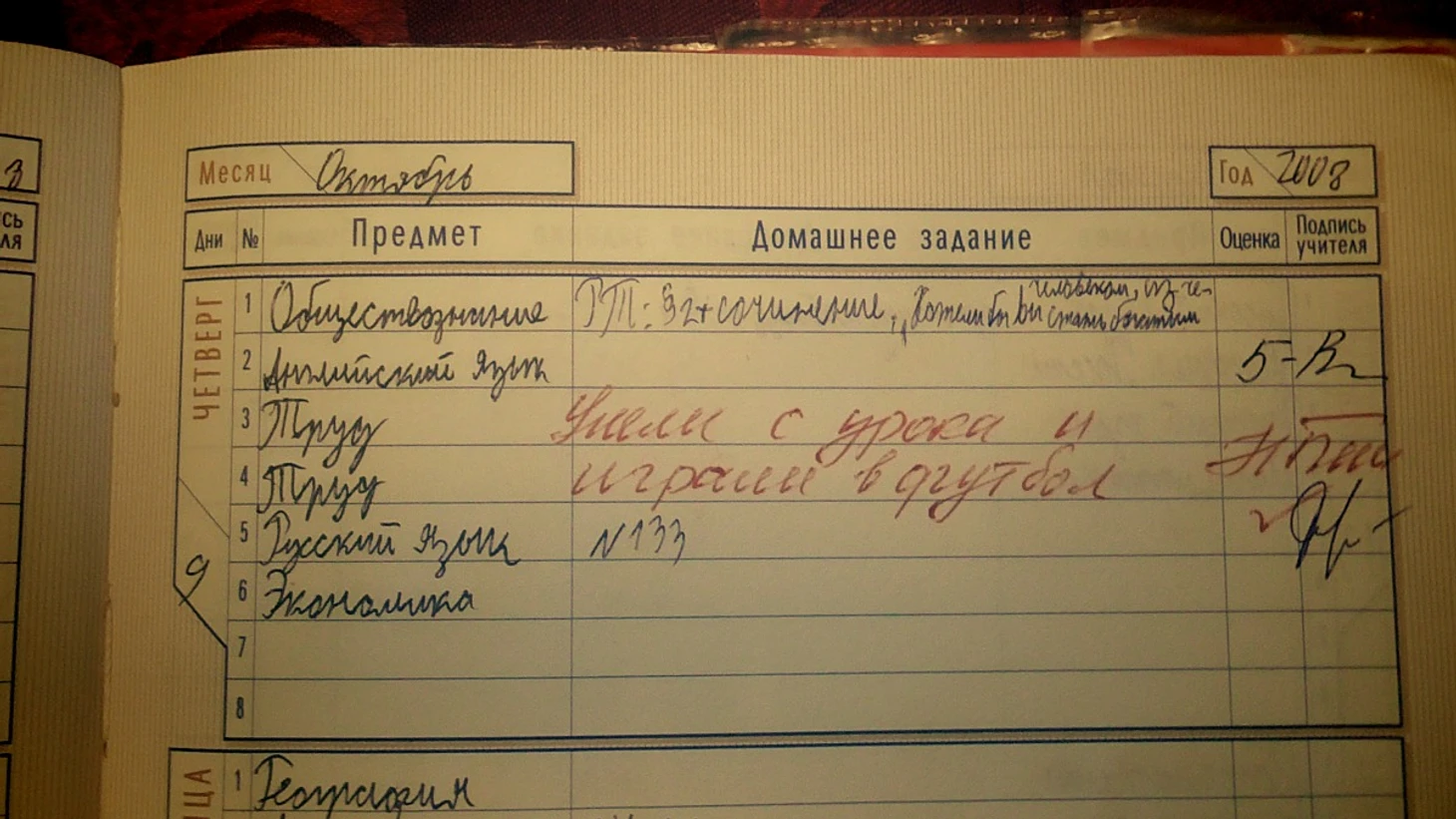 Но вот почему я решил вставить слово про этот дневник. Меня удивили пометки у граф «Физкультура». Тогда наш класс на физкультуре каждый урок играл в футбол на школьном поле – мы были нереальными фанатами игры, каждый из нас уже имел вот эту синтетическую форму с рынка, одевая ее на футбол. Просто поймите – каждый. То есть всегда в классе были те, кто нехотя играл в футбол (или не играл вообще), потому что его не любил. Но у нас любили и пинали мяч все, а это всего человек 12 – идеальные 6 на 6. И получается, я документировал результаты игр – вот была уверенная победа моей команды 2:0, а вот здесь получилась голевая феерия, где мы пропустили на последних минутах, проиграв 7:8. Невероятно приятно осознавать, что такие записи существуют.
