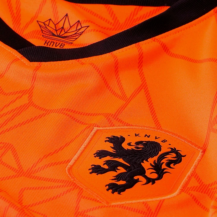 Домашняя футболка по традиции оранжевого цвета с черными вставками по бокам и в области шейного выреза. По всему полю замысловатый узор из ломанных линий. Говорят, дизайнеры вдохновлялись «геометрической графике» 1988 года. Поверим на слово. Если присмотреться к рисунку, можно увидеть стилизованную голову льва, традиционного символа королевской семьи, всей страны и, соответственно, сборной.