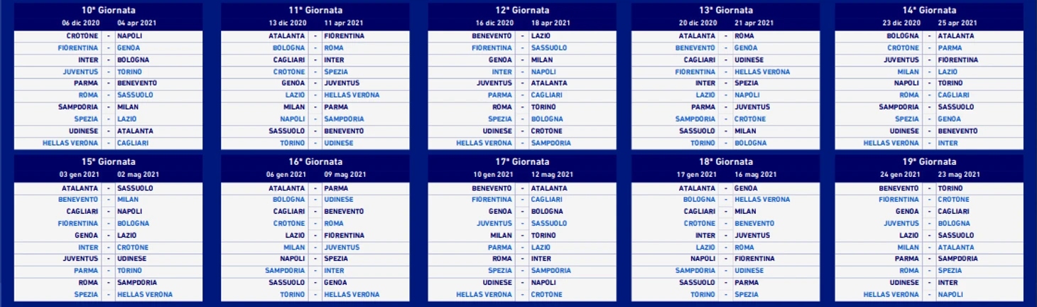 Итальянская Серия А представила календарь на новый сезон. Ниже представлен порядок игровых дней (giornata - день по итальянски), а также даты их проведения в первом и втором кругах.