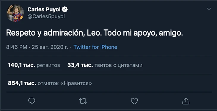 «Вся моя поддержка с тобой, мой друг» - пишет слова поддержки Месси в своем твиттер-аккаунте Карлес Пуйоль.
