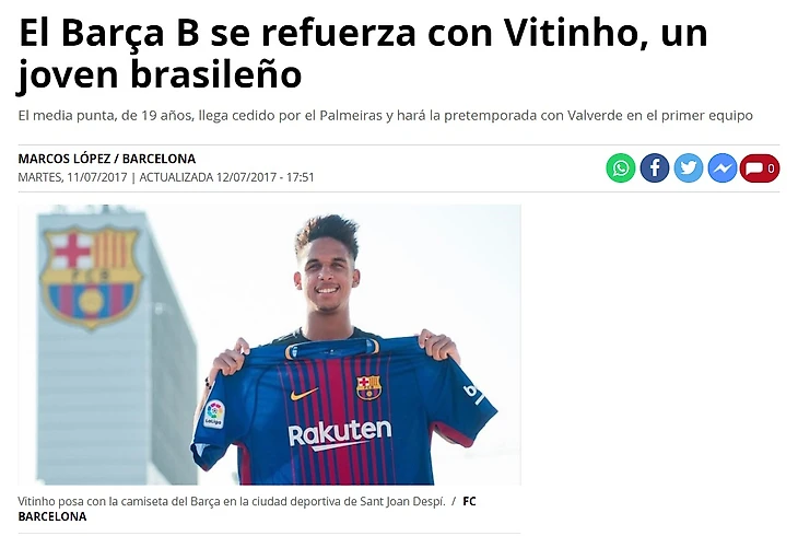В сезоне 2017/18 Витиньо прибыл по договору аренды в «Барсу Б» из «Палмейраса», с опцией выкупа за 15 миллионов евро (ее клуб не активировал). Занятно то, что в тот же год «Барса» подписала Йерри Мину из «Палмейраса» за 11.8 млн евро. На следующий сезон обоих уже не было в клубе.