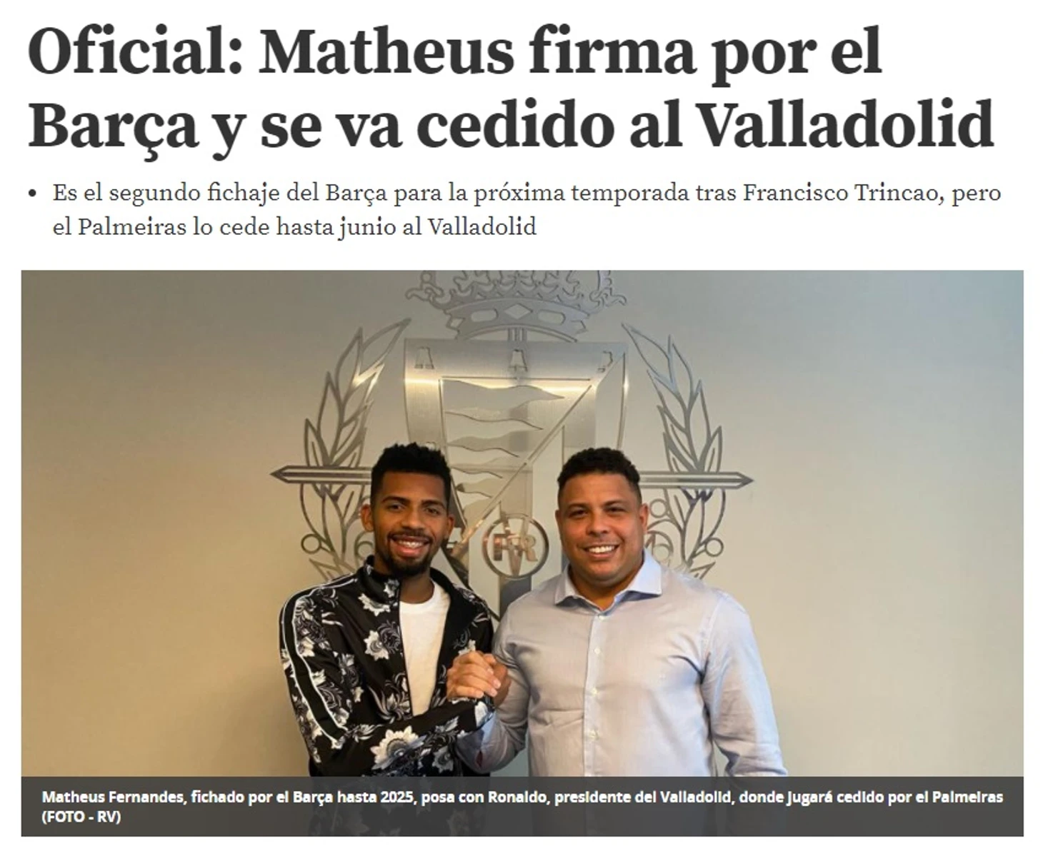 В прошлое зимнее трансферное окно «Барса» заплатила 7 млн евро «Палмейрасу» за Матеуса Фернандеса и отдала его в аренду в «Вальядолид», где он сыграл 166 минут. Теперь он попал на предсезонную подготовку с первой командой «Барселоны».