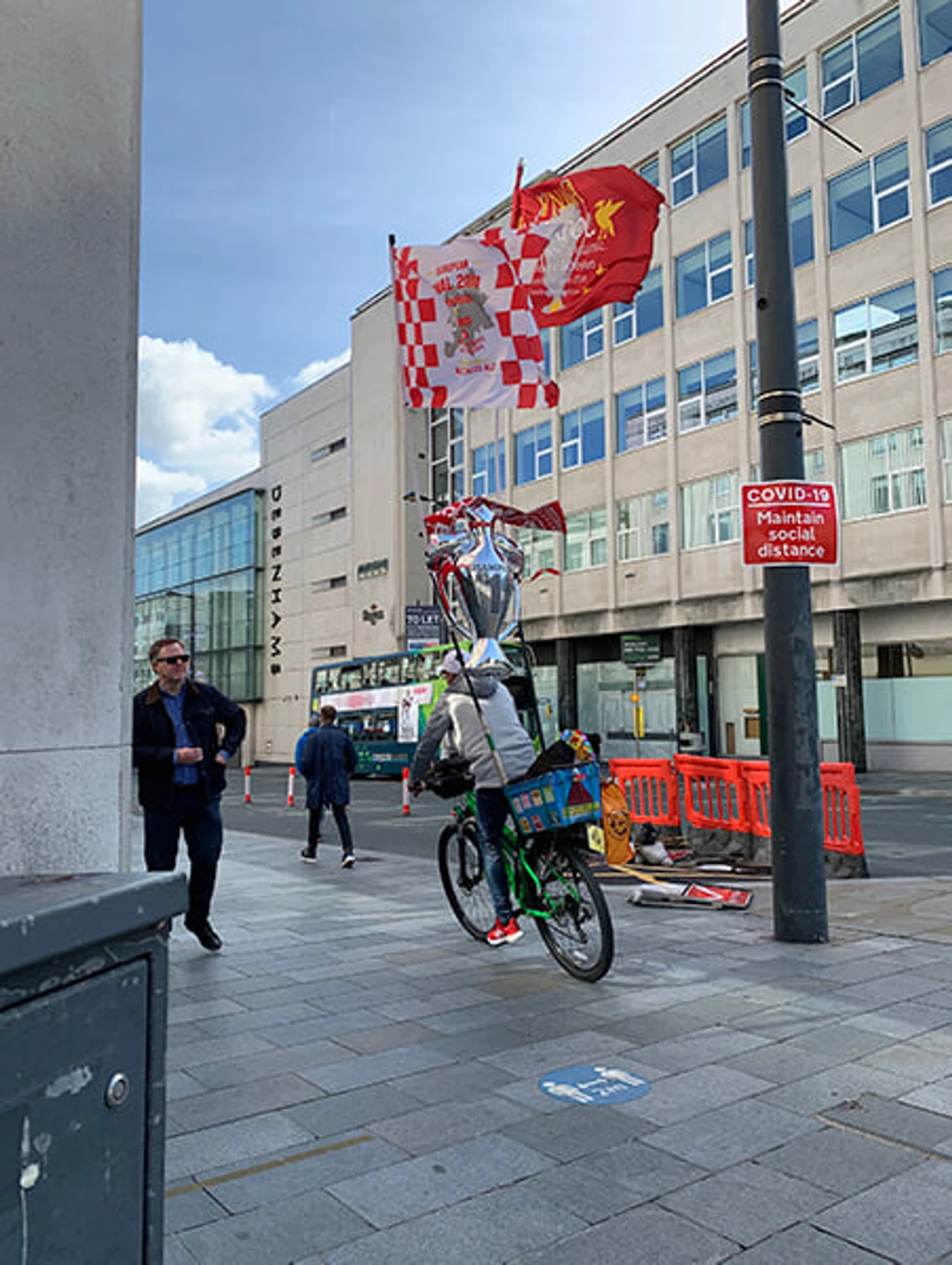 Чемпионское настроение не успело развеяться за пару месяцев. Ливерпуль все еще ждет парада. Правда, с новыми правилами правительства он вряд ли случится раньше 2021-го: в стране вновь растет количество заболевших, и с понедельника англичанам запрещено собираться больше чем по 6 человек. Зато сувенирные палатки в центре пестрят шарфами, а один велосипедист промчался мимо с флагами и воздушным шаром в честь титула.