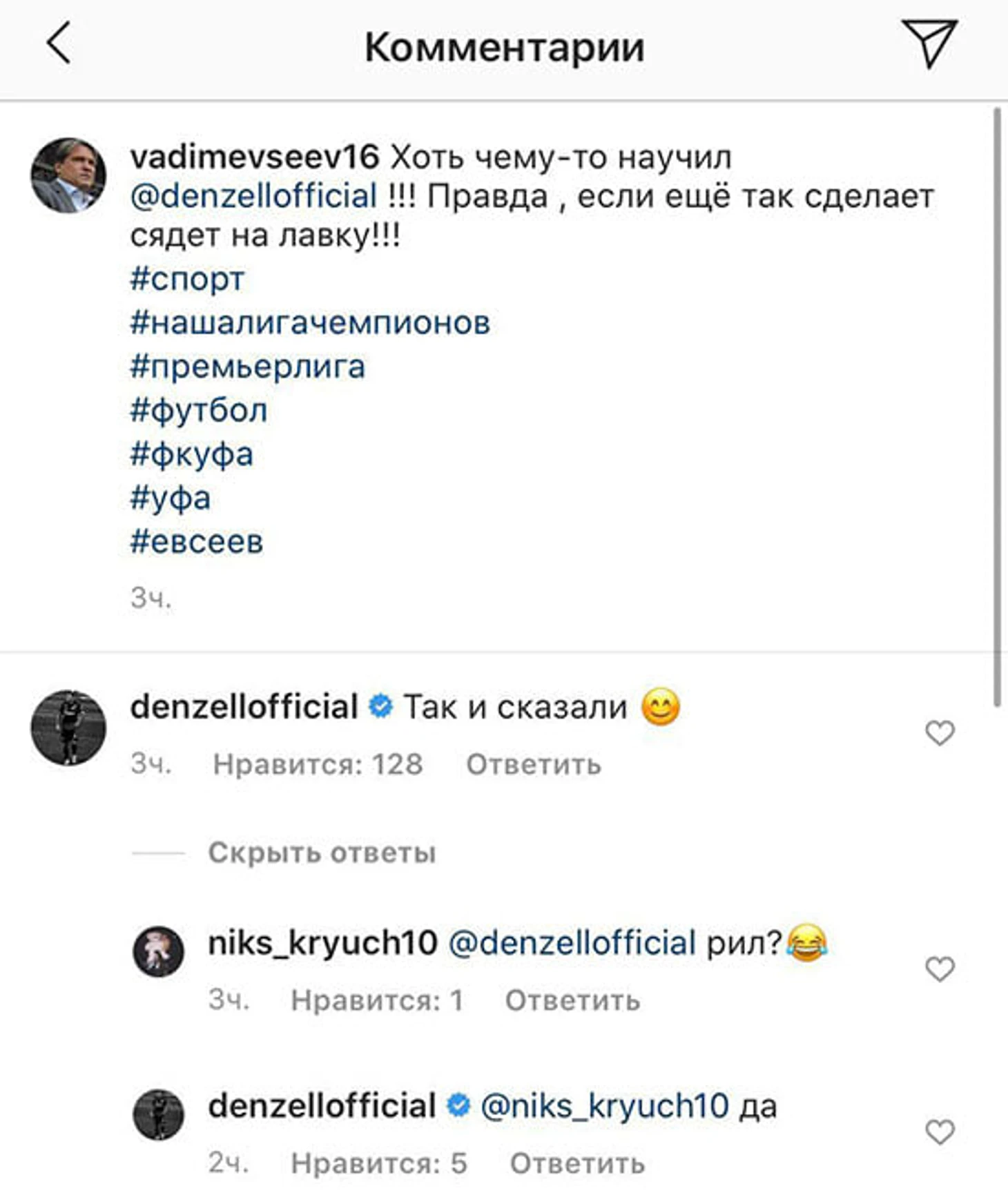 Ассоциация с финтом Кругового только одна: год назад по ходу матча с «Динамо» тренер «Уфы» (и Кругового – Данил выступал в аренде) Вадим Евсеев ровно так же принял мяч в технической зоне. Логично, что днем вторника он выложил трюк своего знакомого в инстаграм. «Хоть чему-то научил Данила! – подписал Вадим. – Правда, если еще так сделает, сядет на лавку!»