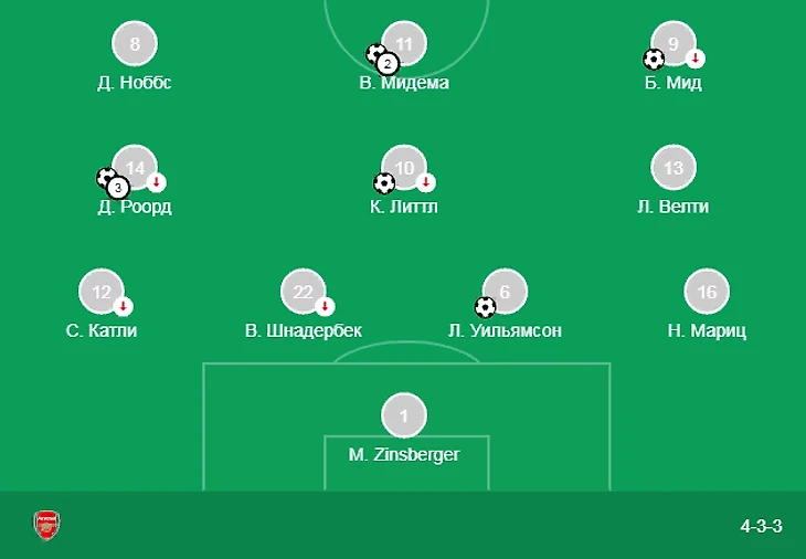В нападение играет Вивианне Мидема - пожалуй самый узнаваемый игрок "Арсенала" и одна из лучших форвардов в мировом футболе. Однако её голы, лишь часть ее игры. Ей нравится уходить от линии офсайда и спускаться до позиции "десятки", позволяя таким игрокам, как Ноббс, Литтл и Ван де Донк, выдвинутся в её зону.