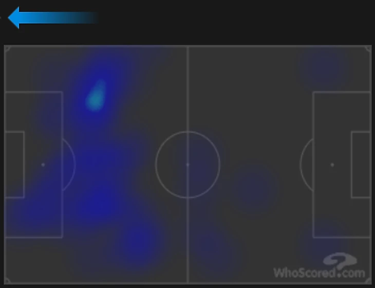 2. Неудачная игра Ловро Бизяка (0 ударов по воротам, 0 попыток дриблинга, 0 выигранных верховых единоборств, 52% точности передач)