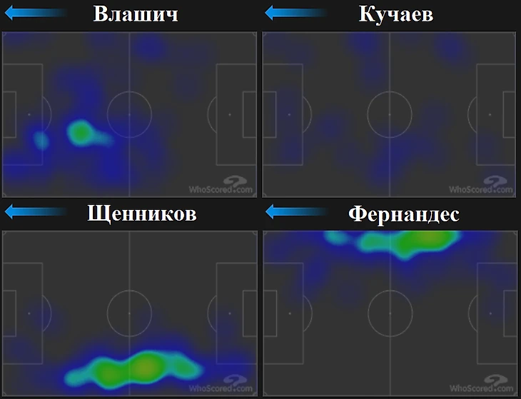 Тепловые карты Влашича, Кучаева, Щенникова и Фернандеса в матче против Уфы.