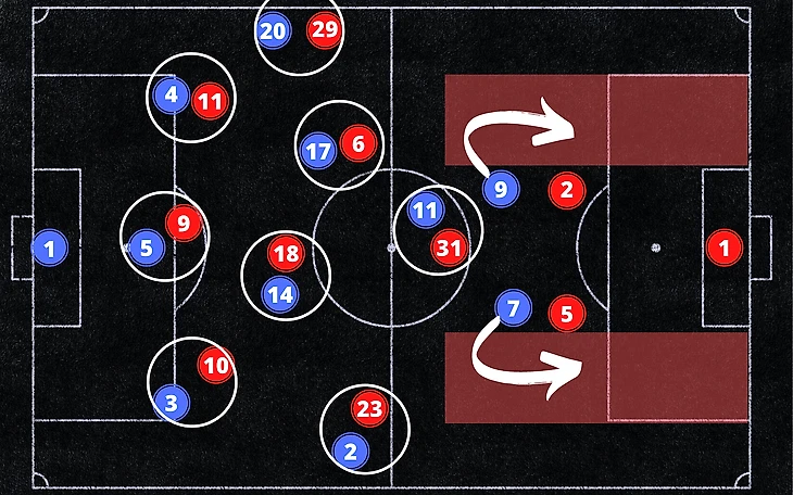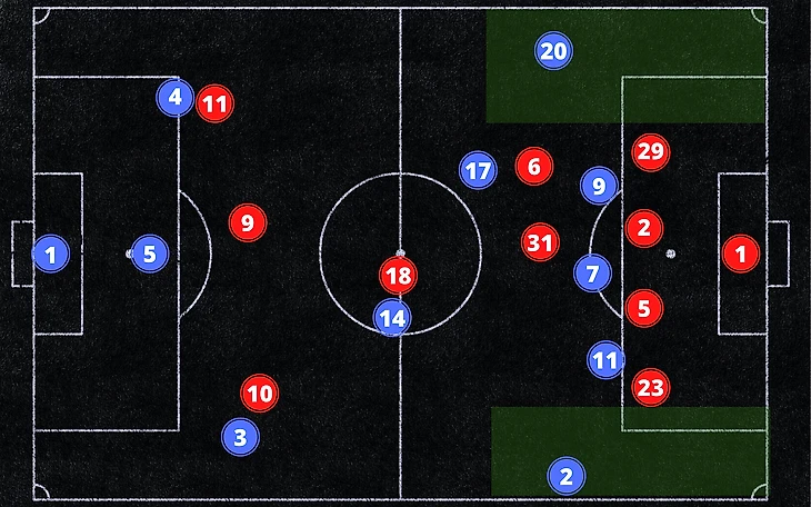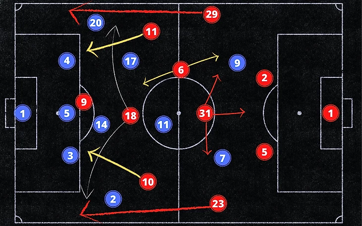 Бруну Фернандеш постоянно смещался на один из флангов, чтобы создать игрокам с мячом варианты для паса. Рэшфорд и Гринвуд при смещениях португальца занимали позицию на полуфлангах, это позволяло исключить дублирование ролей игроков атаки. Погба же должен был занять освободившуюся позицию в центре полузащиты, обеспечивая подбор мяча для атак вторым темпом. Крайние защитники МЮ создавали ширину своими рывками по флангам, периодически самостоятельно продвигая мяч в этой зоне. Все, что оставалось за спинами атакующих игроков "Юнайтед" при позиционной атаке, страховал Матич.