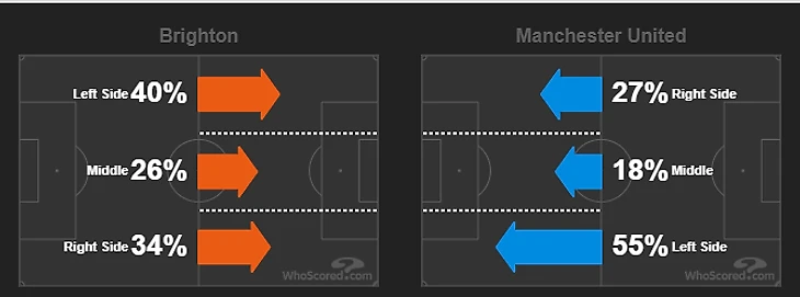 Брайтон играет по схеме с тремя центральными защитниками, в матче против Манчестер Юнайтед использовалось построение 3-4-3. Такие команды, как правило, оставляют много свободных зон на флангах, этим и хотел воспользоваться главный тренер МЮ.